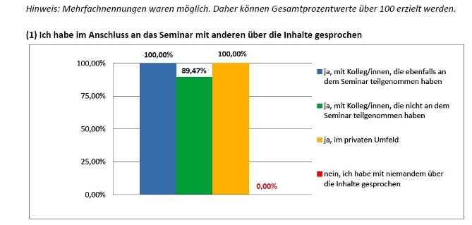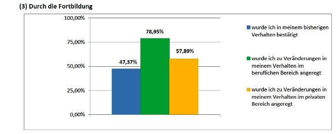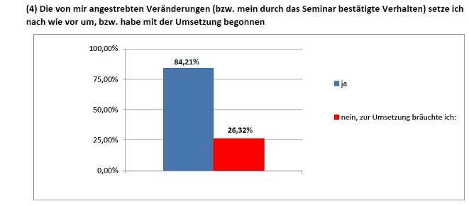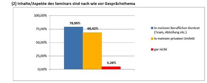 Da wir selbst im Nachgang zum Seminar nur einen begrenzten Zugang zu den Seminarteilnehmern haben, freut es uns umso mehr, wenn Unternehmen den "Langzeittest" machen und uns (wie hier) die Ergebnisse zukommen lassen. Im Folgenden finden Sie die Auswertung einer unternehmensinternen Umfrage - vier Monate nach der Durchführung von insgesamt sechs Inhouse-Schulungen.